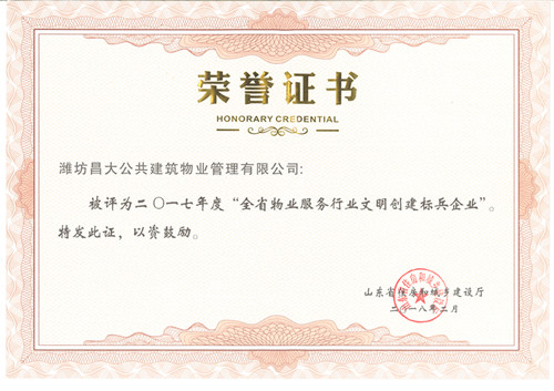 2018年2月被評(píng)為全省物業(yè)行業(yè)文明創(chuàng)建標(biāo)兵企業(yè)